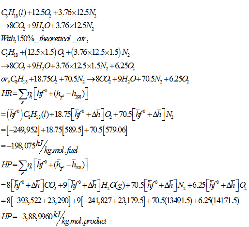 A gasoline engine delivers 150 kW. The fuel used is C8H18(l) and it enters the engine at 25°C. 150 % theoretical air is used and it enters at 45°C. The product of combustion leave the engine at 750 K, and the heat transfer from engines is 205 kW. Determine the fuel consumption per hour if complete combustion is achieved.