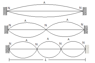 There may be a node N at each end and an anti node A at the center, or there may be a node at the center as well as at the ends, with anti nodes midway between the nodes, and so on. There is always an integral number of antinodes in the steady state modes of vibration. Distance between nodes (or anti nodes) is one half of the wave length, so if L is the length of the string, the wave length λ of the possible stationary waves** are