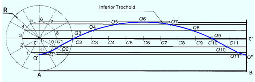 The construction procedure for obtaining an inferior trochoid is shown in figure 2. With centre C’ and radius R, draw a circle. From A, draw a horizontal line AB = 2πR. Draw C’- C” parallel and equal to AB and divide it in to 12 equal parts C1, C2, C3 ,…. C12. Draw the generating point Q’ along C’-A. With centre C’ and radius C’-Q’ draw a circle and divide the circumference in to 12 equal parts and label tham as 1,2,3, ….,12. With C1, C2, C3,etc., as the centres and radius equal to C’-Q’, cut arcs on the horizontal lines through 1,2,3,etc., to locate the points Q1, Q2, Q3, etc. Join Q1, Q2, Q3, etc., to obtain the inferior trochoid.