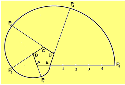 Figure 2 shows the construction of Involute of a regular pentagon. Draw the pentagon A-B-C-D-E. Extend line AE to P6 such that length E-P6 is equal to 5 times AE. Extend line BA, CB, DC, and ED. With A as centre and radius equal to AE draw an arc to intersect the line BA extended at P1. Next with B as centre and radius equal to A-1, draw an arc to intersect the line BA extended at P2. With C as centre and radius equal to A-2, draw an arc to intersect the line DC extended at P3. The procedure is repeated till point P5 is obtained. Draw a smooth curve passing through P1, P2, P3, …, P5 to obtain the involute of the pentagon.