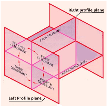 Universally either the 1st angle projection or the third angle projection methods is followed for obtaining engineering drawings. The principal projection planes and quadrants used to create drawings are shown in figure 16. The object can be considered to be in any of the four quadrant.