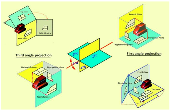 Figure 19 illustrates the difference between the 1st angle and 3rd angle projection techniques. A summary of the difference between 1st and 3rd angle projections is shown if Table 1.