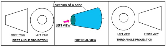 The type of projection obtained should be indicated symbolically in the space provided for the purpose in the title box of the drawing sheet. The symbol recommended by BIS is to draw the two sides of a frustum of a cone placed with its axis horizontal The left view is drawn.