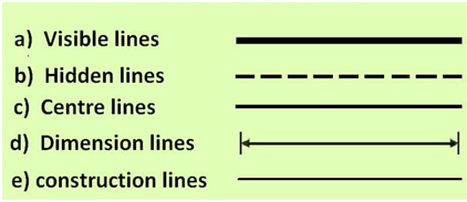 Lines are used to construct a drawing. Various type of lines are used to construct meaningful drawings. Each line in a drawing is used to convey some specific information. The types of lines generally used in engineerign drawing is shown in Table-1.