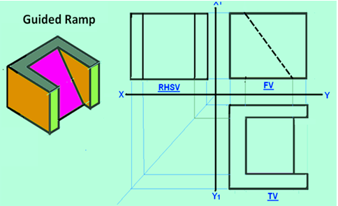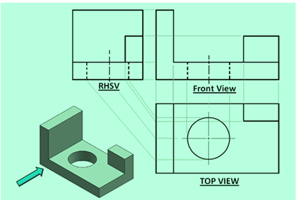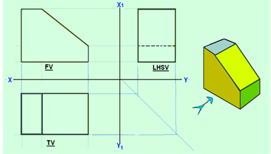 Some ortho graphic projections of solidsĀ showing the different lines and their precedence are shown as examples below. The 3-D view of the respective objects are also shown in the figures with the direction of arrow representing the line of sight in the front view.