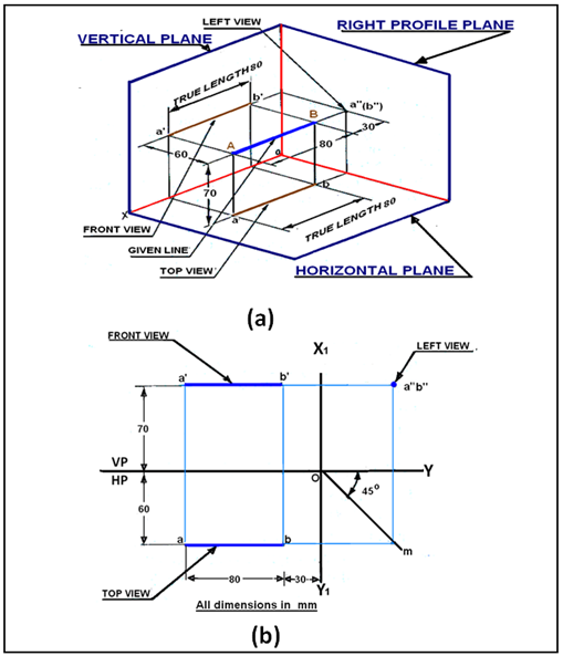 A line AB having length 80 mm is parallel to both HP and VP. The line is 70 mm above HP, 60 mm in front of VP. End B is 30 mm in front of right PP. To draw the projection of line AB, assume the line in the first quadrant. The projection points of AB on the vertical plane VP, horizontal plane HP and Right Profile plane PP is shown in figure 3(a). Since the line is parallel to both HP and VP, both the front view a'b' and the top view ab are in true lengths. Since the line is perpendicular to the right PP, the left side view of the line will be a point a΄΄(b΄΄). After projection on to the projection planes, the planes are rotated such that all the three projection planes lie in the same planes. The multi-view drawing of line AB is shown in Figure 3(b).