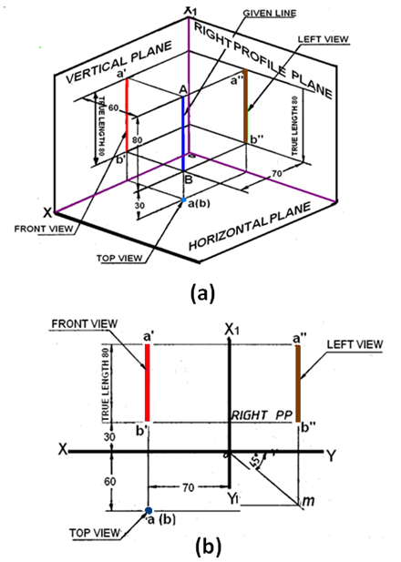 Draw a line XY which is the intersection between VP and HP. Draw the front view a'b' = 80 mm perpendicular to the XY line, with the lower end b' lying 30 mm above the XY line. Project the top view of the line which will be a point a(b) at a distance of 60 mm below XY line. Since the line is 70 mm in front of the right PP draw the X1Y1 line at a distance of 70 mm on the right- side of the front view.