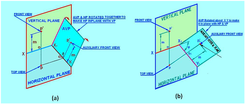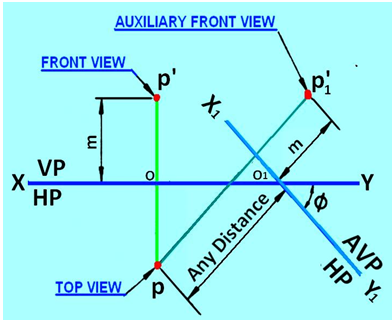 Draw the XY line and mark p and p', the top and front views of the point P. Since AVP is inclined at Φ to VP, draw the X1Y1 line inclined at Φ to the XY line at any convenient distance from p. Since point P is at a height m above HP, the auxiliary front view p1' will also be at a height m above the X1Y1 line. Therefore, mark P1’ by measuring o1p1’=op’ = m on the projector drawn from p perpendicular to the X1Y1 line.