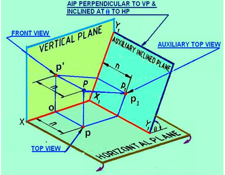 Point P is situated in first quadrant at a distance n from VP. An auxiliary planeAIP is set up perpendicular to VP and inclined at θ to HP. The point P is projected on VP, HP and AIP.
