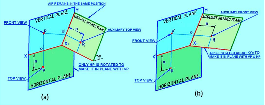 HP is now rotated by 90° about XY line to bring it in plane with VP, as shown in figure 7(a). After the HP lies in-plane with VP, the AIP is rotated about the X1Y1, line, so that it becomes in-plane with that of both HP and VP.