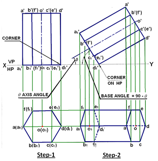 When a solid lies on one of its corners of the base on HP, then the two edges of the base containing the corner on which it lies make either equal inclinations or different inclination with HP. Initially the solid should be placed with its base on HP such that an imaginary line connecting the center of the base and one of its corners is parallel to VP, i.e. to XY line in the top view, and preferably to lie on the right side. For example, when a hexagonal prism has to be placed with a corner of the base on HP such that the base or the axis is inclined to HP, then initially the prism is placed with its base on HP such that an imaginary line connecting the center of the base and a corner is parallel to VP and it lies on the right side. In this position, the first set of top and front views are drawn , as shown in step-1 of figure 2 . The line (o1)(d1) is parallel to the XY line in the top view.