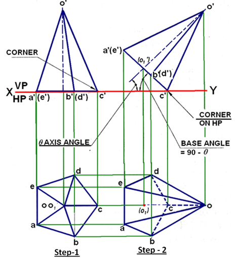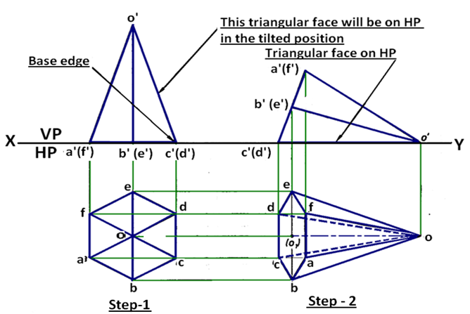 If a pyramid has to be placed on one of its triangular faces on HP, then initially let the pyramid be placed with its base on HP such that the base edge containing that face is perpendicular to VP. (i.e. perpendicular to XY line). Figure 4 illustrates the sequence in obtaining the projections of the pyramid. In the first front view, the inclined line, o’c’(d’) represents a triangular face. Redraw the front view such that the line representing the triangular face o’c’(d’) lies on HP. Project the top view in this position.