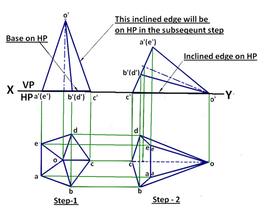 The sequence of obtaining the projections of a pyramid lying on one of its slant edge on HP is shown in figure 5. In step-1, The FV and TV of the pyramid in the simple projection is drawn such that in the, top view the slant edge (line cd) on which it will rest on ground is drawn parallel to HP ( parallel to XY line) in the. In the front view this edge will be line c’ o’. In step-2, the object is then rotated such that the pyramid lies with its edge o’c’ on HP. i.e. in the front view, o’c’ lies on XY line. Project the Top view from this Front view.