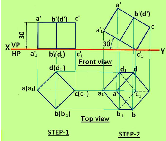 The procedure of obtaining the projections is shown in figure 6. InStep-1, the projections of the cube is drawn in the simple position. The cube is assumed to lie with one of its faces completely on HP such that two vertical faces make equal inclinations with VP. Draw a square abcd to represent the top view of the cube such that two of its sides make equal inclinations with the XY line, i.e., with VP. Let (a1), (b1), (c1) and (d1) be the four corners of the bottom face of the cube which coincide in the top view with the corners a, b, c and d of the top face. Project the front view of the cube. The bottom face a1’b1’c1’(d1’) in the front view coincide with the XY line. Now the cube is tilted on the bottom right corner c1’ (step-2) such that the bottom face a1’b1’c1’(d1’) is inclined at 300 to HP. Reproduce the front view with face a1’b1’c1’(d1’) inclined at 300 to the XY line.