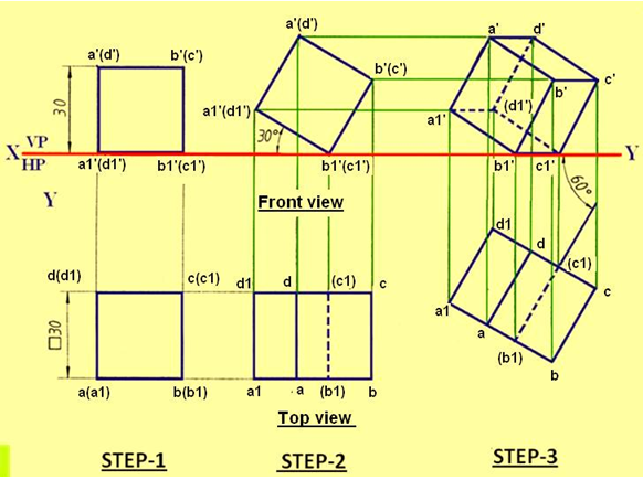 The procedure of obtaining the projections is shown in figure 7. First the TV and FV of the cube is drawn with the cube in the simple position. The edge bc is drawn perpendicular to the XY line. In step2, the cube is tilted such that the base of the cube is inclined at 300 to HP. The front view is reproduced with b1’ c1’a1’d1’ inclined at 300 to XY. The top view of the cube in step-2 is obtained by drawing projectors mentioned in problem 1. In step-3, the top view in step-2 is rotated such that line c1 b1 is inclined at 600 to XY line. The front view in step-2 is obtained by drawing projectors from the top view in step-3 and Front view in Step-2.
