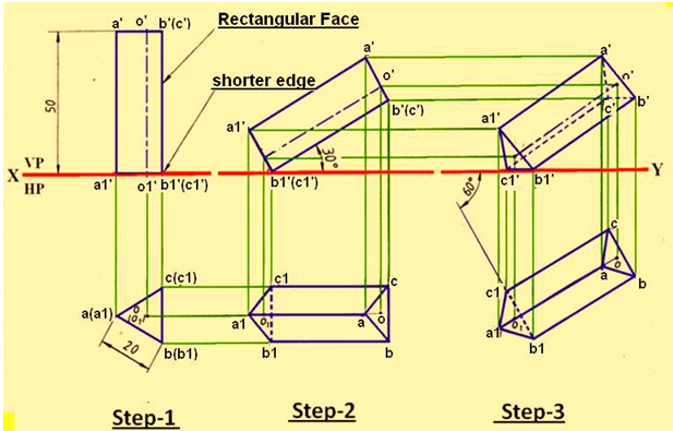 Solution: The procedure of obtaining the projections is shown in figure 8. The prism rests with one of its shorter edges, i.e., triangular or base edge on HP such that the rectangular face containing that edge is inclined at 300 to HP.