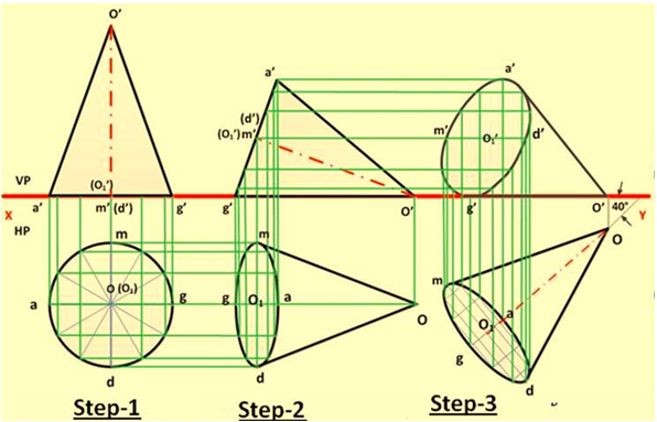 Figure 6 illustrates the procedure for obtaining the projections of the cone. Three steps are involved. In step-1, the Top view and Front View of the cone is drawn in the simple position. The base circle is divided in to 12 equal parts. These points ate joined with the apex to obtain the respective generators. Instep 2, the cone is tilted such that the cone lies on one of its generator in the HP. i.e. the generator g’o’ is made to coincide with the XY line. The top view of the object in this condition is drawn by drawing projectors. In step-3, the cone is titled such that in the top view the axis is inclined at 400 to the XY line. The front view of the object is obtained by projection technique.