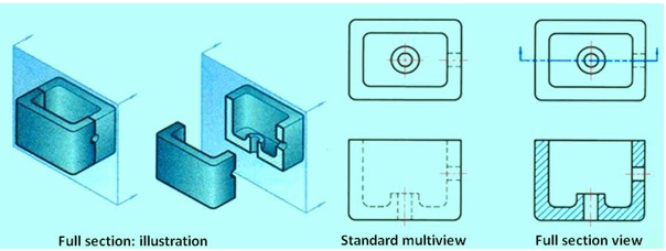 A full section view is made by passing the imaginary cutting plane completely through the object. As shown in figure 21, all the hidden features intersected by the cutting plane are represented by visible lines in the section view. Surfaces touched by the cutting plane have section lines drawn at a 45-degree angle to the horizontal. Hidden lines are omitted in all section views unless they must be used to provide a clear understanding of the object. The top view of the section drawing shows the cutting plane line, with arrows pointing in the direction of line of sight to view the sectioned half of the object. In a multi-view drawing, a full-sectioned view is placed in the same position that an un-sectioned view would normally occupy, I.e., a front section view would replace the traditional front view.