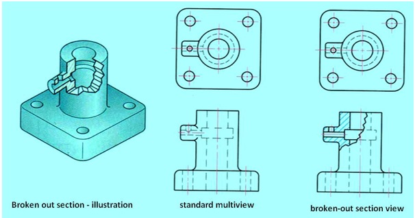 A broken-out section is used when only a portion of the object needs to be sectioned. A broken-out section view of an object is shown in figure 23. A break line separates the sectioned portion from the un-sectioned portion of the view. A break line is drawn freehand to represent the jagged edge of the break. No cutting plane line is drawn. Hidden lines may be omitted from the un-sectioned part of the view, unless necessary for clarity. A broken-out section is also used instead of a half or full section view to save time.