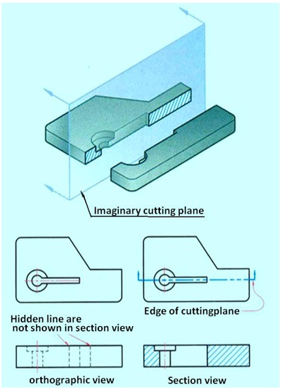 An important reason for using section views is to reduce the number of hidden lines in a drawing. A section view reveals hidden features without the use of hidden lines. Adding hidden lines to a section view complicates the drawing defeating the purpose of clarifying with a section. As illustrated in figure 5, there are times, when a minimum number of hidden lines are needed to represent features other than the primary one shown by the section. In the figure, the through and through cavity may not be represented properly since it could be mistaken with a circular hole.