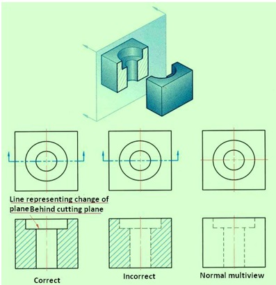 Figure 6 illustrates a full section view of an object. As shown in the correct drawing, the section lined areas are bounded by visible lines, never by hidden lines, because the bounding lines are visible in the section view Visible surfaces and edges that represent a change of planes behind the cutting plane are drawn as lines in a section view.