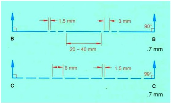 Cutting plane lines are thick (0.7 mm) dashed lines, that extend past the edge of the object 6 mm and have line segments at each end drawn at 90 degrees and terminated with arrows. The arrows represent the direction of the line of sight for the section view and they point away from the sectioned view. Two types of lines are acceptable for cutting plane lines in multi-view drawings. The normal representation of cutting plane lines are shown in figure 12. Line B-B is composed of alternating long and two short dashes, which is one of the two standard methods. The length of the long dashes varies according to the size of the drawing, and is approximately 20 to 40 mm. For a very large section view drawing, the long dashes are made very long to save drawing time. The short dashes are approximately 3 mm long. The open space between the lines is approximately 1.5 mm. Capital letters are placed at each end of the cutting plane line, for clarity or when more than one cutting plane is used on a drawing. The second method used for cutting plane lines is shown by line C-C, which is composed of equal-length dashed lines. Each dash is approximately 6 mm long, with a 1.5 mm space between.