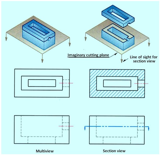 If the cutting plane appears as an edge in the front view and is normal in the top view, it is a horizontal cutting plane. The top half of the object is "removed" and the top view is drawn in section. Figure 13 shows a horizontal cutting plane.
