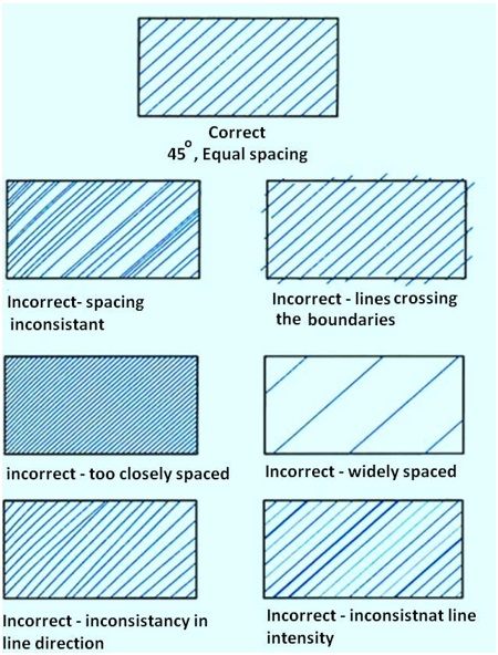 The general purpose cast iron section line is drawn at a 45° and spaced 1.5 mm to 3 mm or more, depending on the size of the drawing. As a general rule, use 3mm spacing. Section lines are drawn as thin (.35 mm) black lines. The section lines should be evenly spaced and of equal thickness, and should be thinner than visible lines . Also, do not run section lines beyond the visible outlines or stop them too short. The correct and incorrect method of drawing section lines are shown in figure 16.