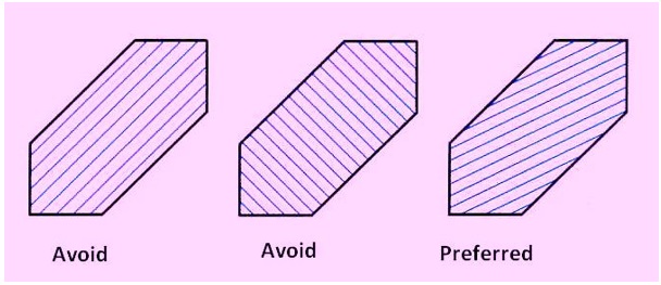 Section lines should not run parallel or perpendicular to the visible outline. If the visible outline to be sectioned is drawn at 45°, the section lines are drawn at a different angle, such as 30° as shown in figure 17.
