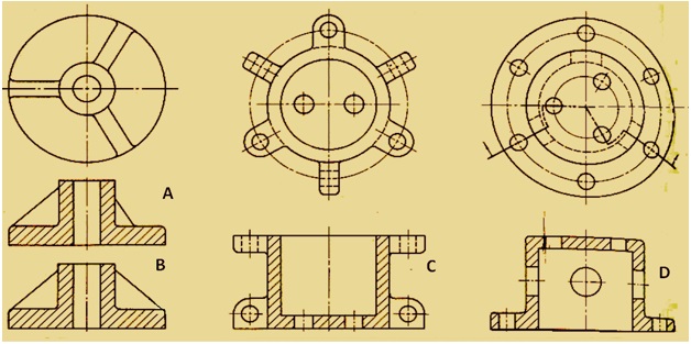 Ribs, lugs and holes often occur in odd numbers and should be aligned to show the true relationship of elements. Figure 3 shows the normal practice of drawing revolved sections of ribs, holes, and lugs. True projection of the ribs (A) show the pair on the right shortened suggesting that they does not extend to the outer edge. Section (B) shows symmetry. Rib part is not sectioned. At (C), the lugs and holes are aligned showing the holes at their true radial distance from the axis. Ribs are never shown sectioned (hatched).
