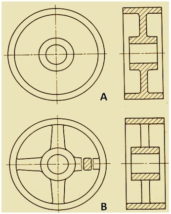 The practice of drawing revolved sections of pulleys having web and spokes are shown in figure 4. . Pulley A has a solid web connecting the hub and rim. Pulley B has four spokes. Even though the cutting plane passes through two of the spokes, the sectional view of B must be made with out hatching the spokes in order to avoid the appearance of a solid web.