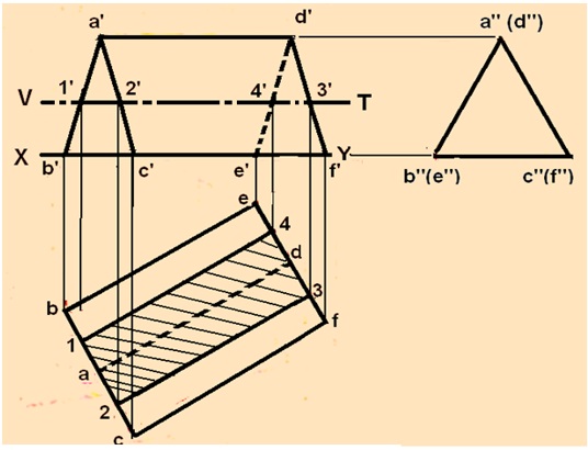 Solution: The Top view and front view of the triangular prism with respect to the projection planes is drawn first. In the Front view, the section plane (line V-T) which is parallel to HP will be a line parallel to and 12 mm above XY line. It is evident from figure 7. that the line VT intersects with the edges a’-b’ at 1’, a’-c’ at 2’, d’-e’ at 4’ and d’-f’ at 3’. Draw verticalprojectors from this points to meet the edges a-b at 1, a-c at 2, e-d at 4 and d-f at 3 respectively. When the top portion of the prism is removed, the top view will beobtained as a rectangle, i.e the hatched region bounded by 1-2-3-4.