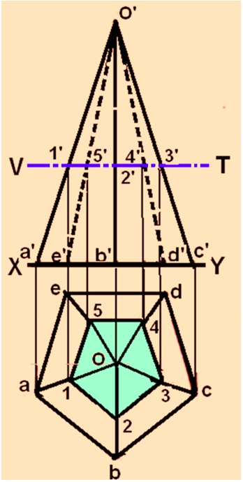 Solution : Figure 8 shows the solution of the problem. The sectional view is obtained in the same manner as in probel-1. Here the intersection the slant edges of the pyramid with the section plane is projected on to the respective edges in the top view.