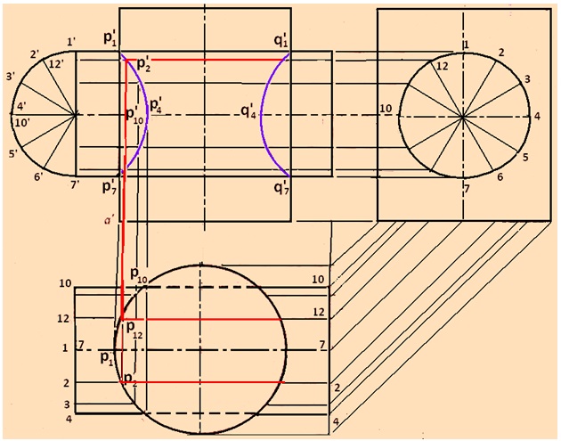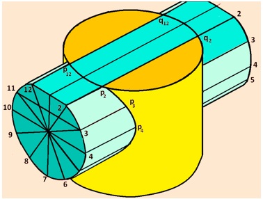 Other cutting planes are also assumed passing through 3-11, 4-10, etc and the procedure repeated to obtain other points p3’, p4’, p5’, etc. Similar procedure is adopted to obtain points q1’, q2’, etc on the right hand side. Since the axis to the two cylinders intersect, points p2’ and p12’ will coincide and hence cannot be shown in the figure.