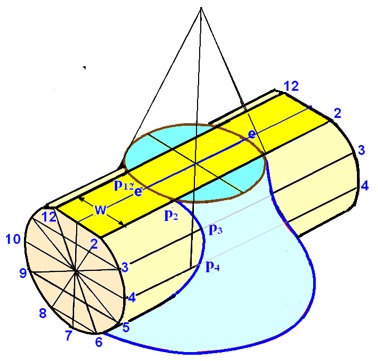 Figure 5 illustrate the cutting plane method for obtaining the curve of intersection. In this the top view of the cone after sectioning will be a circle and that of the cylinder will be a rectangle with width W. The diameter of the circle and the width of the rectangle in the top view will depend on the height of the section from the cone base. At each height, the intersection points P2, P3, P4 … are obtained and finally these points are joined by a smooth curve in the front view.