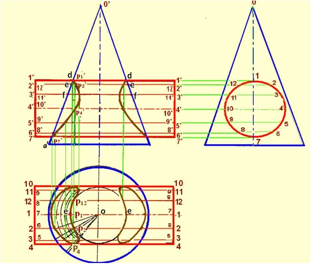 Assume a horizontal cutting plane passing through say, point 2. The section of the cylinder will be a rectangle of width w (i.e. the line 2-12), while that of the cone will be a circle of diameter ee. These two sections intersect at points p2 and p12. These sections are clearly indicated in the top view by the rectangle 2-2-12-12 and the circle of diameter ee. In the front view, the cutting plane is seen as a line coinciding with 2' 2’. Points p2 and p12 when projected on the line 2' 2’ (with which the line 12'-12' coincides) will give a point p2' (with which p12' will coincide). Then p2' and p12' are the points on the curve of intersection. To obtain the points systematically, draw circles with centre 0 and diameters dd, ee, ff,etc. cutting lines through 1, 2 and 12, 3 and 11 etc. at points p1, p2 and p12, p3 and pll etc . Project these points to the corresponding lines in the front view.