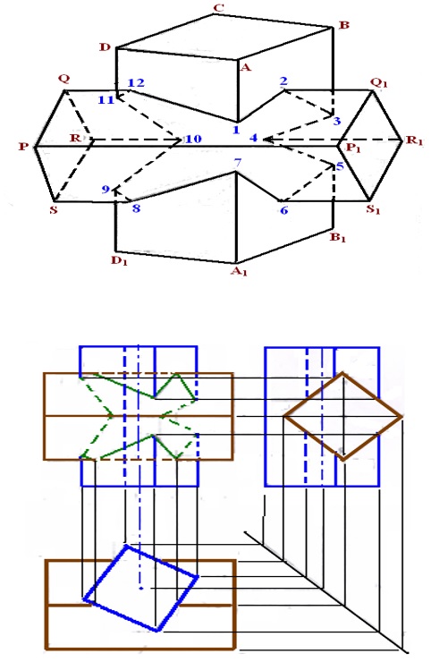 Problem: A square prism of 40 mm edge of base and 90 mm high rests vertically with its base on HP such that the front right vertical rectangular face is inclined at 60° to VP. This prism is penetrated by another horizontal square prism whose rectangular faces make equal inclination with both HP and VP. The axis of the horizontal prism is passing at the mid height at a distance of 10 mm infront of the vertical prism. The horizontal square prism is of the same dimensions as that of the vertical square prism. Draw the lines of intersection.