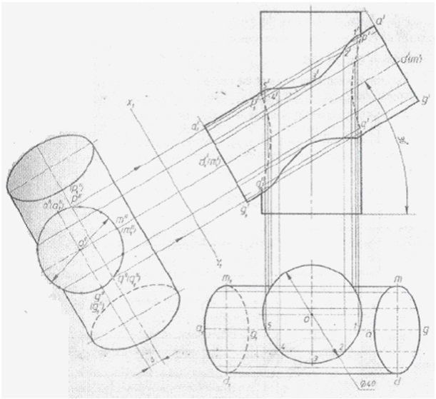 A vertical cylinder of 40 mm diameter and 80 mm high is intersected by another cylinder of 35 mm diameter and 80 mm long. The axis of the penetrating cylinder is inclined at 30° to HP, parallel to VP, 6 mm infront of the vertical cylinder and appears to bisect it in front view. Draw the intersection curve.