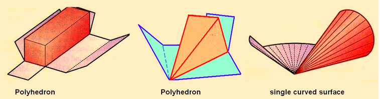 As illustrated in figure 3, polyhedrons are composed entirely of plane surfaces that can be flattened true size onto a plane in a connected sequence, where as single curved surfaces are composed of consecutive pairs of straight-line elements in the same plane which is obtained for a cone.
