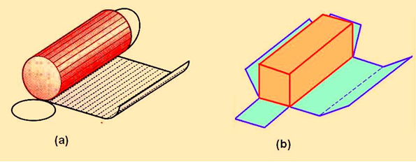 1. Parallel-line development: They are made from common solids that are composed of parallel lateral edges or elements. e.g. Prisms and cylinders as shown in figure 5. The cylinder is positioned such that one element lies on the development plane. The cylinder is then unrolled until it is flat on the development plane. The base and top of the cylinder are circles, with a circumference equal to the length of the development. All elements of the cylinder are parallel and are perpendicular to the base and the top. When cylinders are developed, all elements are parallel and any perpendicular section appears as a stretch-out line that is perpendicular to the elements.