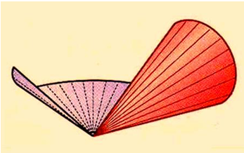 Radial-line developments are made from figures such as cones and pyramids. In the development, all the elements of the figure become radial lines that have the vertex as their origin. Figure 6 shows the radial development for a cone. The cone is positioned such that one element lies on the development plane. The cone is then unrolled until it is flat on the development plane. One end of all the elements is at the vertex of the cone. The other ends describe a curved line. The base of the cone is a circle, with a circumference equal to the length of the curved line.