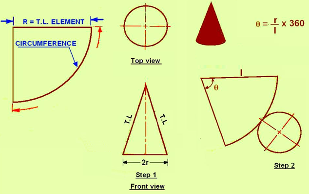 The development of a cone is shown in figure 4. For a cone, the front view will be a triangle with the slant edge showing the true length of the generator of the cone. To begin this development, use a true-length element of the cone as the radius for an arc and as one side of the development. Draw an arc whose length is equal to the circumference of the base of the cone. This can also be determined by angle θ = (r/l) * 360°, where, r is the radius of the base of the cone and l is the true length of the slant edge. Draw another line from the end of the arc to the apex and draw the circular base to complete the development.