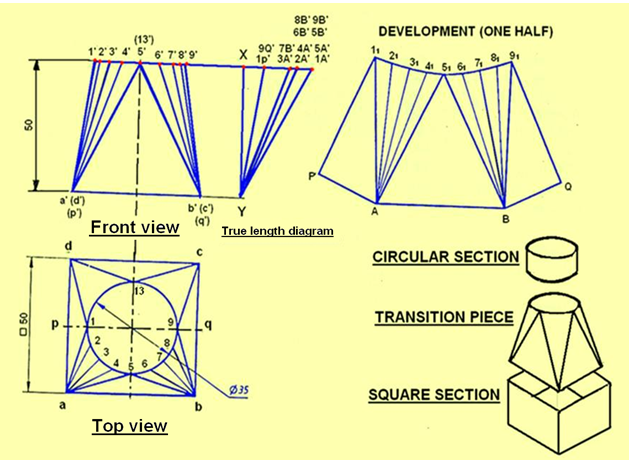 Since the transition piece is symmetrical about the horizontal axis pq in the top view, the development is drawn only for one half of the transition piece. The front semicircle in the top view is divided in to eight equal parts 1,2,3,4, etc. Connect points 1,2,3,4 and 5 to point a. Project points 1,2,3,etc to the front view to 1’,2’,3’. etc. Connect 1’, 2’, 3’ etc to a’ and 5’, 6’, 7’, 8’ 9’ to b’. The development of the one half of the transition piece is drawn from the true length diagram. The procedure for drawing the true length diagram is explained below.
