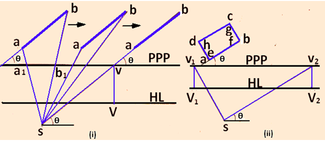 Vanishing point of the line AB (line ab in the top view), lying on the ground and inclined at an angle to the picture plane can be obtained by drawing a line parallel to its top view and passing through the station point s. The intersection of this line with the PPP, (i.e. v) is the top view of the vanishing point. The front view V is obtained by projecting point v to the Horizon line(HL) as shown in figure 1.