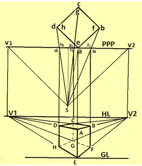One edge of the object is kept parallel to the PPP., as shown by line AE of figure 3. The two faces, ABFE and ADHE, sharing the edge AE are inclined to the PPP. Each edges perpendicular to the edge AE and parallel to PPP will converge to two vanishing points on HL on either side of the observer. To obtain the vanishing points, draw lines parallel to edge ab and ad and passing through the station point. The intersection of these line with PPP are respectively v1 and v2. From v1 and v2, drop vertical projectors to HL to obtain the vanishing points V1 and V2 respectively. Since edge AE is in PPP, the front view of this edge (AE) will be its true length. Draw lines from V1 and V2 and passing through points E and A in the Front view . To obtain the perspective for the edges BF, CG and DH, join the respective points in the top view with the station point s. label the points where these rays pierces the PPP as a1, b1, c1, d1, e1, f1 and g1. Draw vertical projectors from d1 and h1 to intersect the lines joining V1 to A and E in the front view. Similarly points B and F are obtained by drawing the vertical projectors from b1 and f1 and intersecting the lines joining V2 with A and B in the front view. Points C and G are obtained by drawing the vertical projectors from c1 and g1 in the top view and the respective intersection of the lines joining V2 to D and H (or lines joining V1 to points B and F.