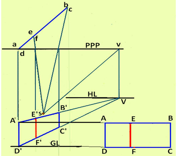When a line is in the picture plane, it is seen in its true length in perspective. The top view and Front view of a rectangle ABCD, shown in figure 4, whose surface is vertical and inclined to the picture plane is shown as abcd and ABCD. DC is on the ground plane and edge AD is in the picture plane. In the perspective view , edge A’D’ is equal to the true length AD. Edge B’C’ is shorter than BC. The length B’C’ is derived from A’D’ and V.