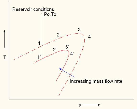Consider the case of subsonic flow with increased mass flow rate. Initial isentropic expansion in the nozzle is given by the vertical line joining reservoir conditions and point 1 in Fig. 13.4. If we add heat in the flow through constant area duct then the process of heata addition is represented by the dotted curve in the same figure. Suppose we increase the mass flow rate by decreaseing exit pressure, then static enthalpy or static temperature at the entry to the heating duct decreases. Hence length of the initial vertical line increases and the nozzle exit conditions for subsonic flow are represented by 1'.