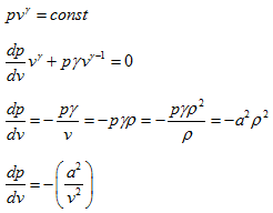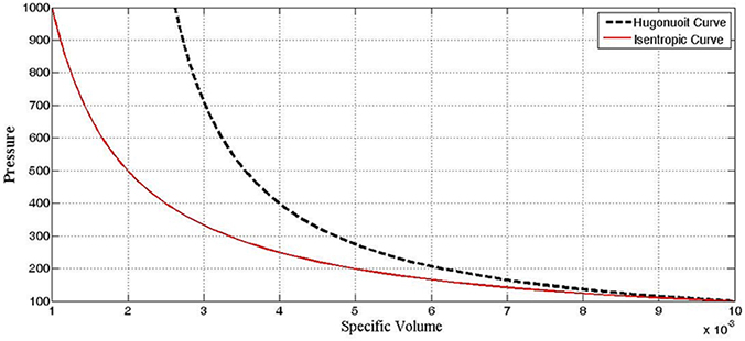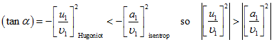 In the same figure Hugoniot curve is plotted along with isentropic curve for compression. These curves originate from the same point. Slope of curve representing isentropic compression can be calculated as,