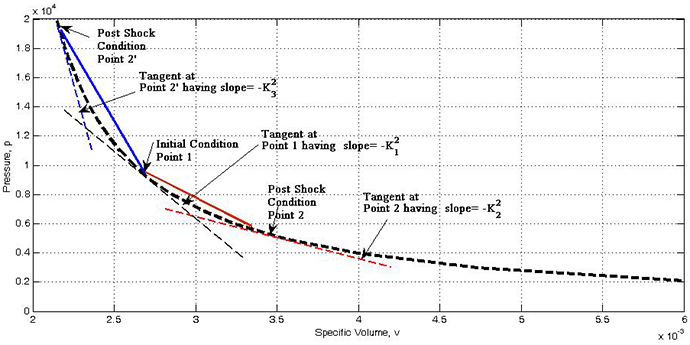 The above figure will help us in finding most probable post shock condition. In this figure, along with Hugoniot curve, three different lines are drawn to get various possible post shock conditions. These lines correspond to different massflow rates or freestream conditions forming the normal shock. One of those lines is tangent to Hugoniot curve at point 1 which represents the initial condition or pre-shock conditions. Hence the straight line at point 1 has slope (-k12) which is same as the Hugoniot curve at that point,