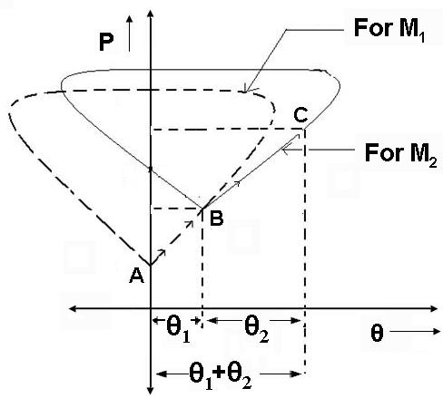 Pressure-deflection diagram is very useful for understanding various flow features like shock-shock interaction, shock reflection etc. Therefore the main objective of working with this diagram is to understand the deflection of flow which encounters various shocks. Consider a supersonic flow experiencing two left running shock waves shown in Fig. 21.3. Corresponding P-θ is shown in Fig. 21.4.